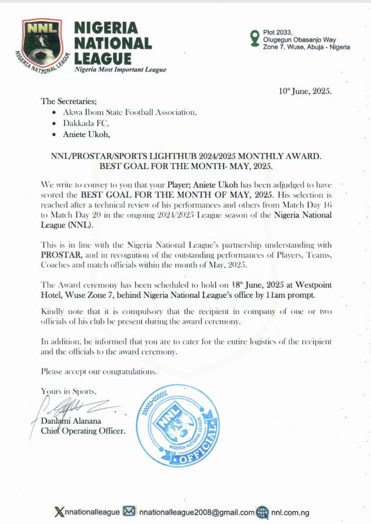 Anietie Uko of Dakkada FC, has been announced as the winner of the Nigeria National League (NNL) Goal of the Month award for May 2025.